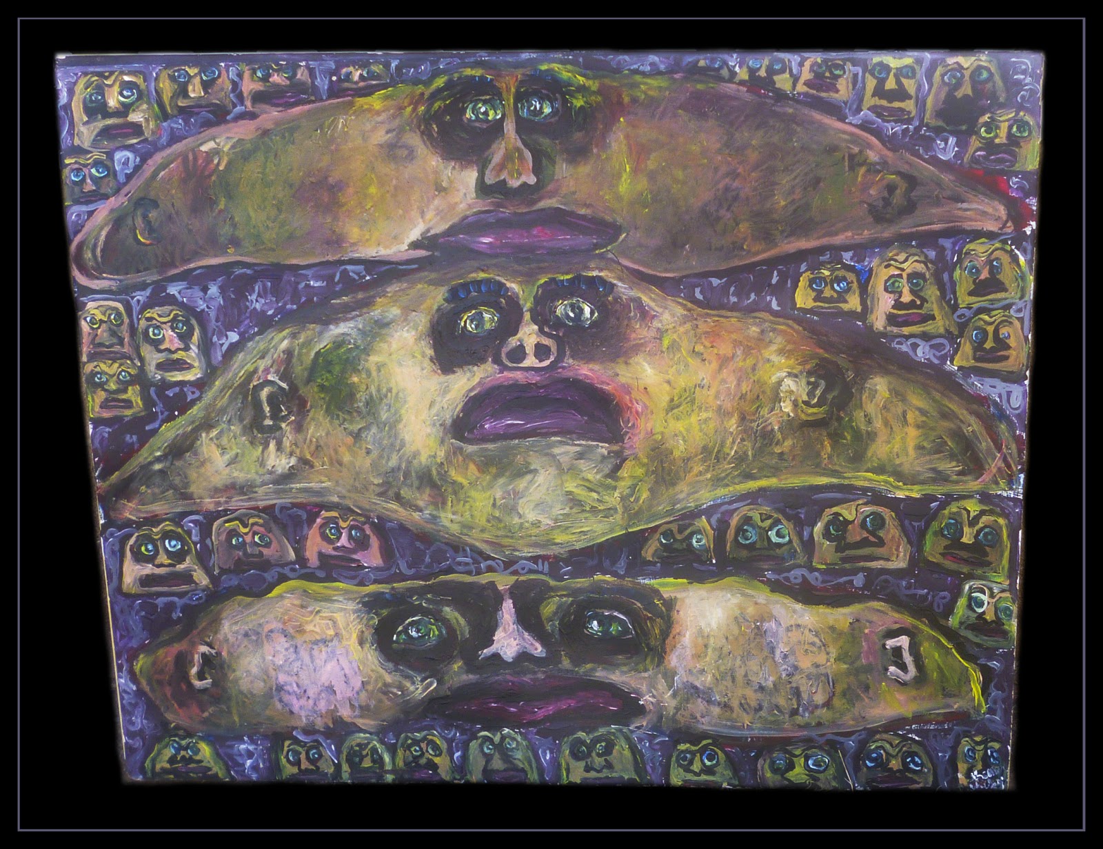 Whiting’s artwork shows both the positive and negative aspects of bipolar disorder. Despite the large, smiling figures in many of the paintings, the overall feel of the paintings is very unsettling. “My circus-like paintings are influenced by my manic periods, which are artificial and can feel like a bad sugar rush,” says Whiting.
